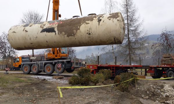 Unser professionell gereinigter Öltank ist noch bestens in Schuss. Anstatt ihn zu verschrotten, bekommt er deshalb ein zweites Leben. Per Schwertransport wird der 10 Tonnen schwere Koloss zu den Koberhöfen geliefert. Dort wird er fortan als Löschwassertank verwendet. Eine super Aktion, die Feuerwehrkommandant Bernhard hier eingefädelt hat!