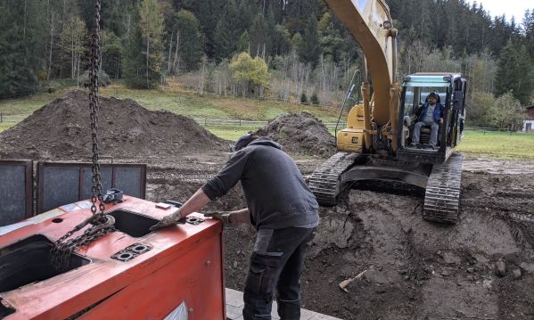 Nach 42 Jahren treuer Dienste erweisen wir der Ölheizung die letzte Ehre. Der Heizkessel wog rund zwei Tonnen. Gut, dass der Bagger noch zur Stelle war.