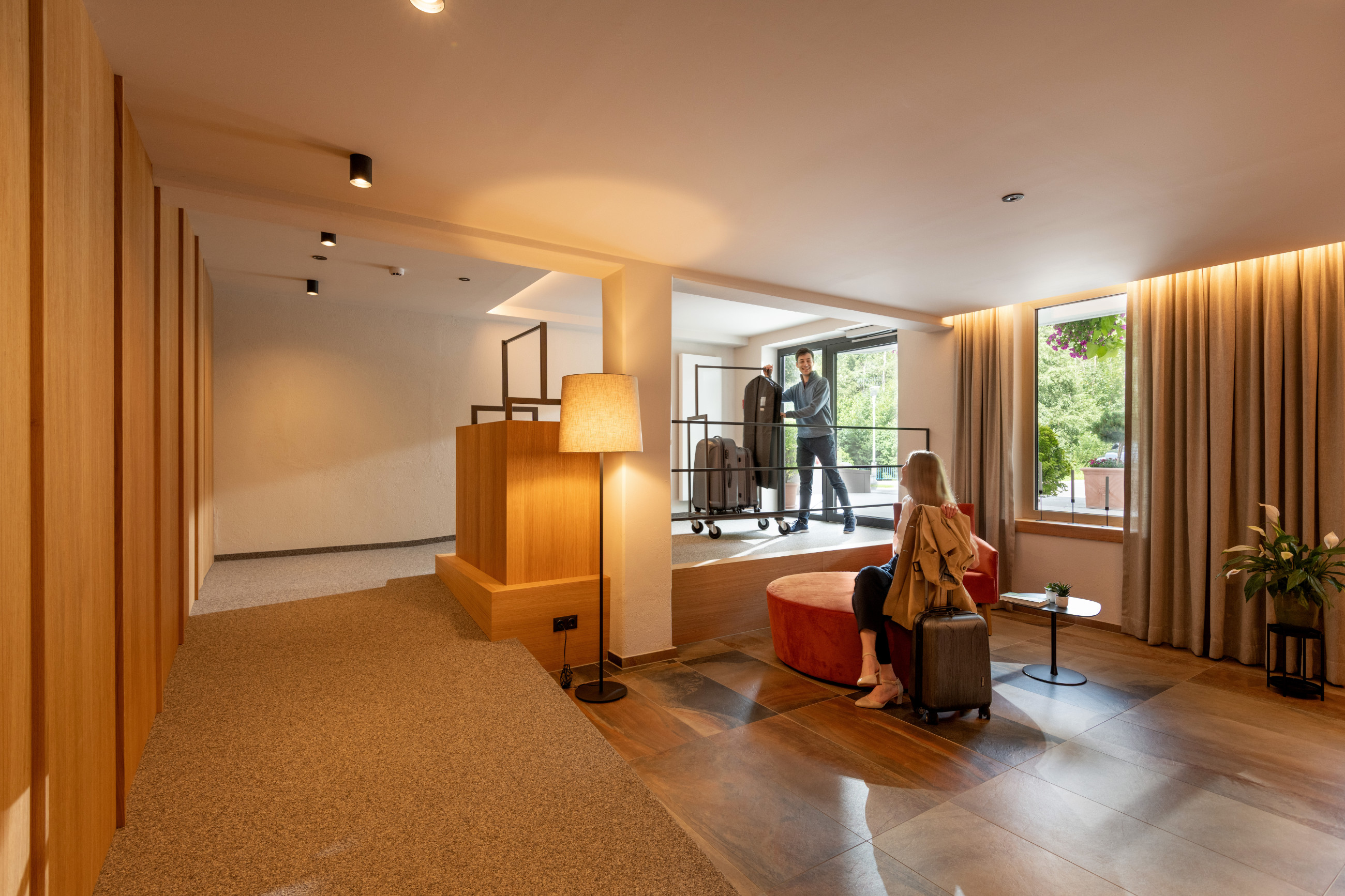 Unser neuer Eingangsberich im Untergeschoss ermöglicht eine komfortable Anreise. Obendrein macht er auch einiges her - so wie die ebenfalls neu gestaltete Billiard-Lounge in warmen Naturtönen gestaltet verbreitet er schon bei der Anreise den Charme des Haflingerhofs.