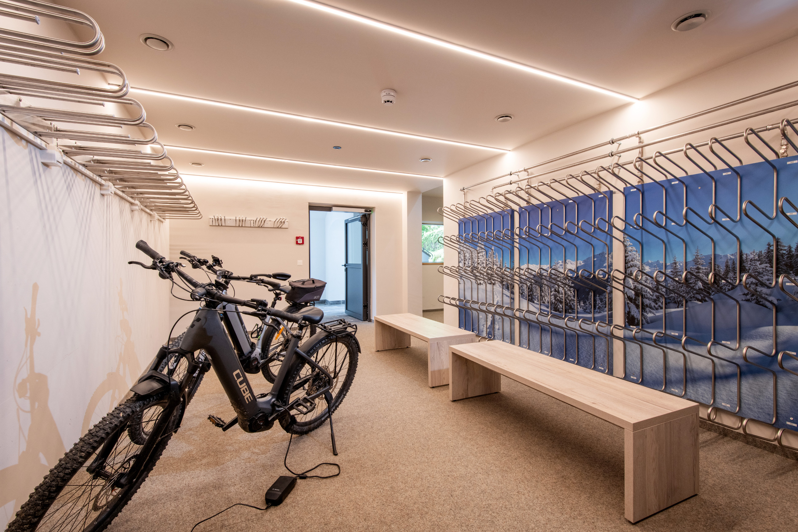 Auch an unsere sportlichen Gäste haben wir gedacht: Im Winter sorgt unser neuer Ski-Raum für wohlig warme Skischuhe, im Sommer finden E-Bikes ihren Platz - inklusive Lademöglichkeit. Auch sonstiges Freizeit- und Reitequipment kann hier deponiert werden. Jedes Zimmer hat seinen eigens reservierten Platz.